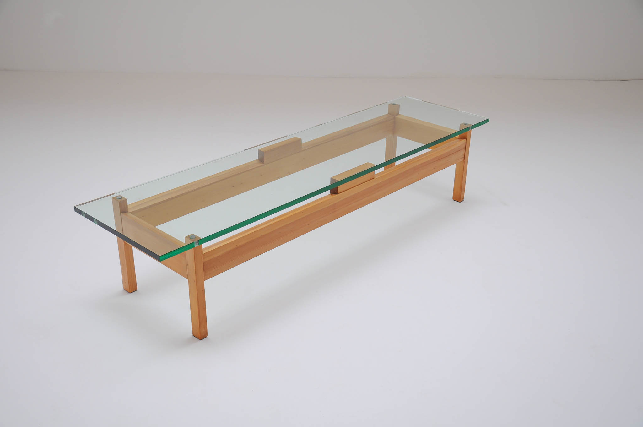 A long and low table designed by Emiel Veranneman in Parana pine wood. It can function as a low console table against a wall or in a classic coffee table position. The original glass top is in perfect condition.
