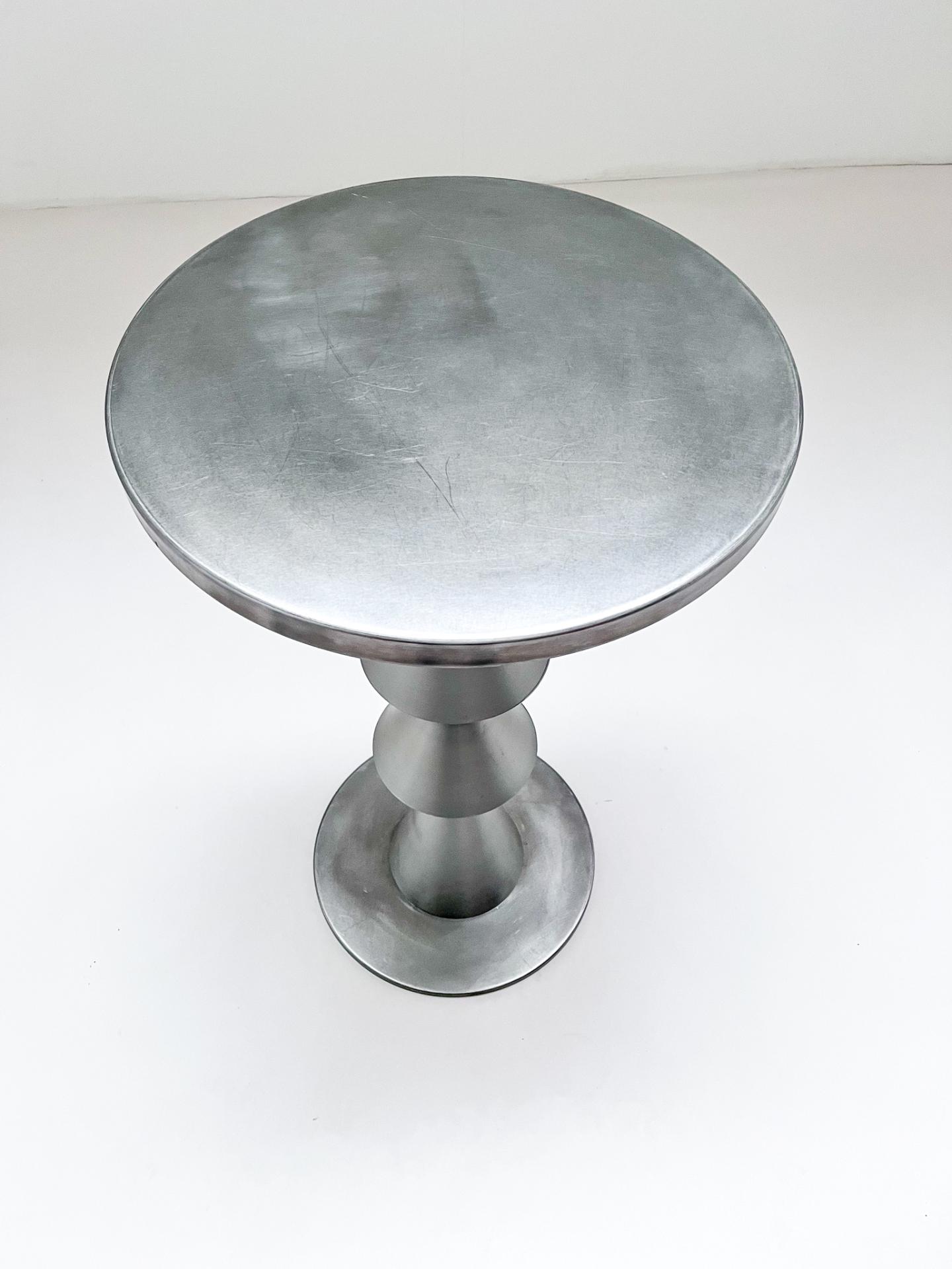 Rare ‘Tavola Bar’ table by James Irvine for metals group. Consisting of a group of stacked cones in deep-drawn anodized aluminum and a base in satin-finish nickel-plated steel.